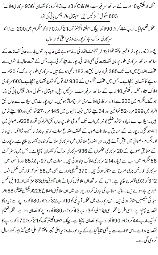 Peshawar (News Reporter) Khyber Pakhtunkhwa Disaster Management Authority has prepared a preliminary report on the loss of life as well as official financial losses due to the recent rains in the province. Under which 385 people have died and 182 have been injured in different districts so far. Official property has suffered a loss of Rs 20 billion. In which 936 buildings of different departments have been severely damaged. 603 government properties destroyed, Irrigation Department tops with 10 billion. Roads, bridges, hospitals, schools, water channels submerged in water More than 2000 government properties were badly damaged in Battagram. In this report. The dead from the flood include 299 men, 52 women and 34 children while the injured include 145 men, 27 women and 10 children. The total number of deaths in the most affected district of Buner has reached 228 and in Swabi 41. According to the report, these accidents have occurred in different districts of the province: Swat, Buner, Bajaur, Mansehra, Shangla, Lower Dir and Battagram, Swabi. The financial damage to government properties in these districts and areas. According to the report, 936 government properties of 20 government departments of the province have been damaged. In which the highest number of 214 government properties were destroyed in District 58 Battagram. 97 in Swat, 65 in Bajaur and Mansehra government buildings have been badly damaged. 370 educational institutions, including 58 schools, have been completely damaged while 312 have been partially damaged. Along with this, 83 major and minor roads and 10 bridges leading to these areas have been completely destroyed. In the report issued on the recent floods, 226 irrigation channels and 68 water supply schemes have been affected in these areas and districts. In this report, the Irrigation Department has suffered a loss of more than Rs 10.32 billion and 8 million. Similarly, the C&W Department has suffered a loss of Rs 3.43 billion and 8 million. The Education Department has suffered a loss of Rs 1.44 billion and 9 million. Public Health Engineering has suffered a loss of Rs 21.7 million. In this regard, it has also been informed that this report has been sent to the Chief Minister of Khyber Pakhtunkhwa, Ali Amin Gandapur.