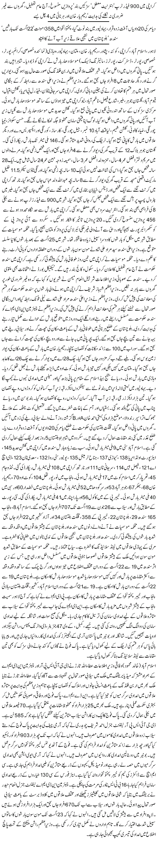 Lahore, Islamabad, Karachi, Quetta, Peshawar, Rahim Yar Khan, Multan, Bahawalpur, Vehari (Special Correspondent, Crime Reporter, Special Reporter, District Reporters, Monitoring Desk) Heavy rains submerged Karachi. Highways were closed. Water entered houses. Urban flooding situation arose in different areas of the city. 8 people died in wall collapses and other accidents. The Prime Minister contacted the Chief Minister of Sindh and assured all kinds of cooperation in the emergency situation. In Karachi, Surjani Town, Federal B Area, Gulshan-e-Iqbal Qayyumabad, Gulistan-e-Jauhar, Malir, Shara-e-Faisal, Nazimabad, New Karachi received heavy rain with strong winds. Water accumulated in the inner streets along the main roads. In Gulshan-e-Hadeed, the streets were flooded due to heavy rain and water entered the houses. People started storing their valuables in safe places. Rainwater accumulated in Hassan Square, Nipa Chowrangi, Zia Colony, Gulshan-e-Shamim, Liaquatabad No. 10, Jail Chowrangi, Karsaz, Korangi and Expressway and other areas. Traffic flow was severely affected. Up to 146 mm of rain was recorded. 14 people were killed and one person was injured when a wall of a house collapsed near Gulistan-e-Jauhar Block 12. The deceased include Maryam daughter of Afzal, age 4, Hamza son of Afzal, age 3, and Samia wife of Mubeen, age 24. A 28-year-old man died, his identity was not known, a 10-year-old child was injured. An 8-year-old child, Abdullah son of Abbas, died when a wall of a house collapsed near the Aqsa Mosque in Orangi Town Sector 11.5 Khalil Market. One person died of electrocution in North Karachi and another died of electrocution in Defense Khayaban Bukhari. One person was burnt to death in a fire at a petrol pump in Malir. Power supply to 8 of the 900 feeders in the city was also cut off. Internet service was also suspended. 456 flights were canceled in Karachi due to limited visibility due to rain. 20 flights were delayed. An IP flight from Skardu to PK was diverted to Sukkur Airport and a foreign airline flight from Dubai was diverted to Multan. According to the Meteorological Department, the second spell of rains in the city on Tuesday was more intense. A new series of rains is expected in the city after August 25. Sindh Chief Minister Syed Murad Ali Shah has ordered the relevant agencies to remain on high alert during the monsoon rains. The Meteorological Department has predicted three days of torrential rain in Karachi. The Sindh government has declared a public holiday in Karachi today. Schools and colleges will remain closed. The Technical Board has also postponed exams. Sindh Provincial Information Minister Sharjeel Inam Memon has asked citizens not to step out of their homes unnecessarily. Prime Minister Shahbaz Sharif has offered all kinds of assistance to the Sindh government over the rains in Karachi. The Prime Minister made a telephonic contact with Sindh Chief Minister Murad Ali Shah and offered to provide all kinds of assistance to deal with this emergency situation. The Prime Minister directed the Chairman NDMA to be in constant touch with the Sindh government and be fully prepared for the rain expected in the next one or two days. Three children died after the roof of a house collapsed due to torrential rain in Balochistan’s Harnai district and were swept away by a flash flood. One child died after being swept away in water and two children died after the roof of their house collapsed. More than 100 houses were damaged in Sorab. In Rahim Yar Khan, a wall of a house collapsed due to rain. A laborer died after being buried under the debris. Abid of Chak 26A died after a wall collapsed in Chak 28A. In Multan, there was light rain and in some places heavy rain. In Kot Addu, it rained for one and a half hours. It rained in Vehari. The water level of the Sutlej River rose at Head Islam and relief teams set up camps in Mailsi. Hundreds of acres of land were submerged in the Lala Dera settlement in Bahawalpur, causing crores of rupees in losses to farmers. Three thousand acres of agricultural land were submerged. Farmers lost crores of rupees. The water level in the Chenab River rose in Bosan due to the rain. Settlements and mango orchards were in danger. The Ahmed Khan A and B settlements of Jhok Uttar Aspar Rindwala area of Tehsil Kot Chatha, Hazara village were hit by the flash floods that came yesterday. Water entered houses. The Gilgit-Baltistan government has declared 20 valleys of Diamer district as disaster-hit. Several closed places have been restored in Ghizer district. The Baltistan Highway in Skardu has been restored for traffic after 5 days. Islamabad City received 9 mm of rain. The highest rainfall was recorded in Sindh in Karachi at Gulshan-e-Hadeed 145, Airport Old Area 138, Keamari 137, Jinnah Terminal 135, University Road 132, Saadi Town 123, DHA 121, Faisal Khan 114, Surjani Town 111 and North Karachi 108 mm of rain. Tando Jam 45, Tharparkar received 17 mm of rain in Islamkot. In Punjab, Noorpur Thal received 104 mm of rain, Kot Addu 70 mm, Rahim Yar Khan 68 mm, Bhakkar 67 mm, Joharabad 53 mm and Sargodha 52 mm. In Balochistan, Khuzdar received 60 mm of rain and Sibi 40 mm of rain.